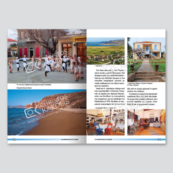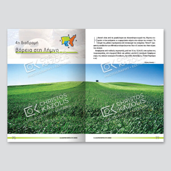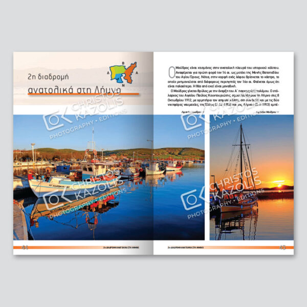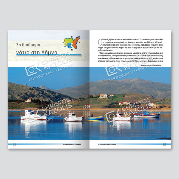 Ο Χρήστος Καζόλης σας ξεναγεί στη μυθολογία, την ιστορία και τα αξιοθέατα της Λήμνου με έναν πλήρη τουριστικό οδηγό 96 σελίδων, συνδυάζοντας αντιπροσωπευτικές φωτογραφίες του με τα κείμενα του Μανώλη Ρόκκου.